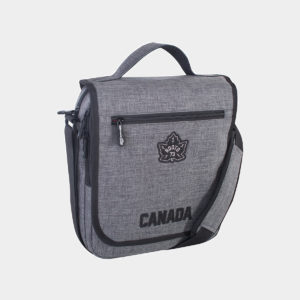 Zippered shoulder bag on the top. Double front pockets with zipper and magnetic closure. Large back pocket with zipper. Adjustable shoulder strap with a length of 15 “Internal features are Roots print lining, zipper and open sliding pockets.
