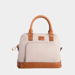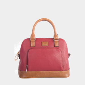 Rounded leatherette bag with high zipper. Silver hardware. Front pocket. Rear pocket with zipper. Leatherette double handles with a length of 5 “Internal features are Roots print lining, zipper and open sliding pockets.