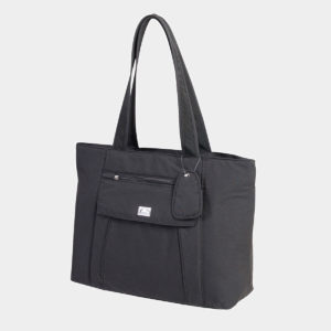 Computer tote with zipper at the top. Double leather handles with contrasting 10 “in length Front zip pocket with internal pocket Flap pocket with RFID protection Rear panel to slide on the luggage handle Internal features are printed lining, Laptop, wall zipper and 2 zippered pockets.