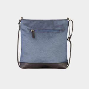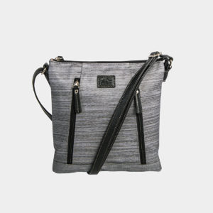Crossed shoulder bag with zipper on the top. Silver hardware. Zippered front and back pocket. Leatherette trim. Adjustable shoulder strap in faux leather with a length of 14.5 inches. Internal features are Roots print lining, zipper and open sliding pockets