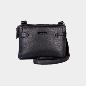 Double zippered polyester shoulder bag compartment. Silver hardware. Double front pockets with zipper. Adjustable shoulder strap in faux leather with a length of 14 “. Internal features are printed lining, zipper and double open sliding pockets.