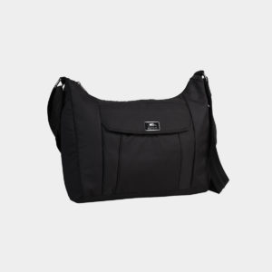 Zippered shoulder bag on the top. Silver hardware. Zippered front and back pocket. Adjustable shoulder strap in faux leather with a length of 10.5 “Internal features are Roots print lining, zipper and open sliding pockets.