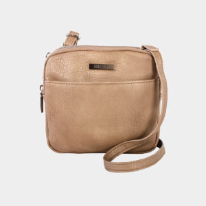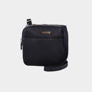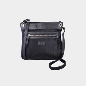 Crossed shoulder bag with front pocket and silver hardware. Front and back pocket with zipper. Adjustable shoulder strap in faux leather with a length of 14.25 “Internal features are Roots print lining, zip and open sliding pockets.