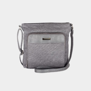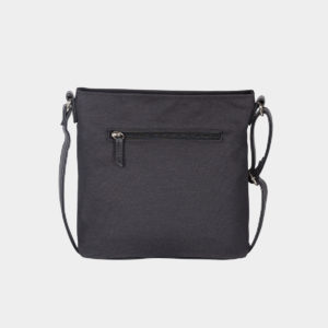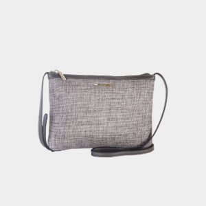 Crossed textured shoulder bag with zipper on the top. Silver hardware. Front pocket with organizer. Zippered back pocket. Adjustable shoulder strap in faux leather with a length of 14 “. Internal features are Roots print lining, zipper and open sliding pockets.